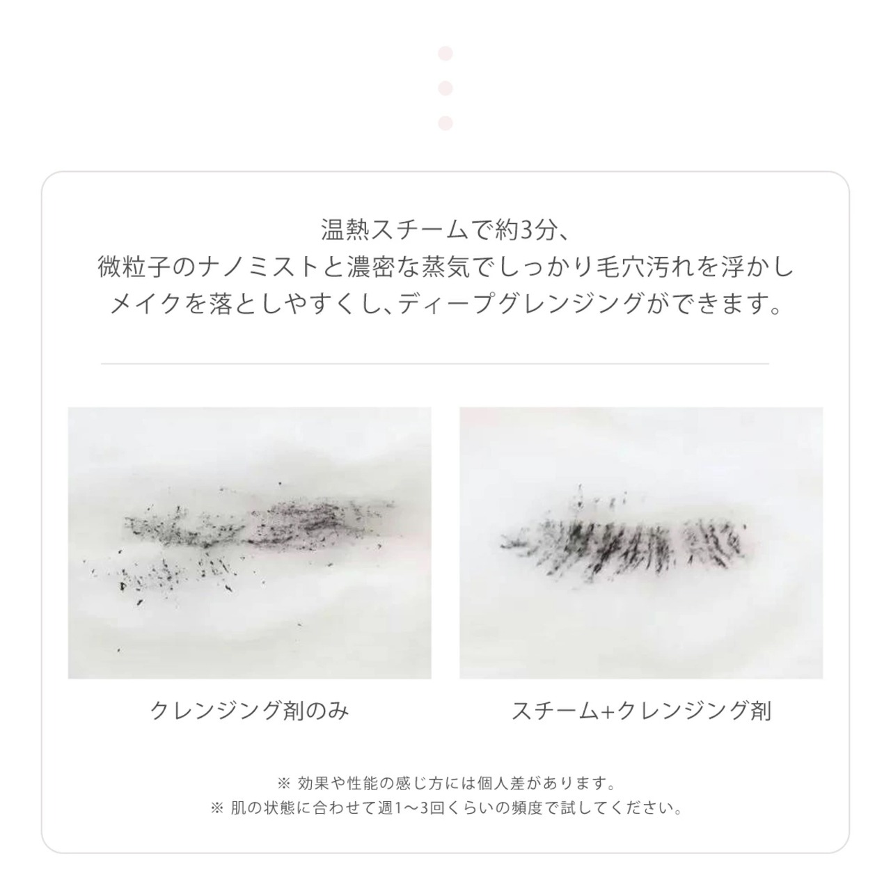 スチームを浴びながらスキンケアを行うことで 毛穴が開いて汚れを落としやすくなるのと同時に 肌が柔らかくなるので、美容成分の浸透しやすくなります(※角質層まで)