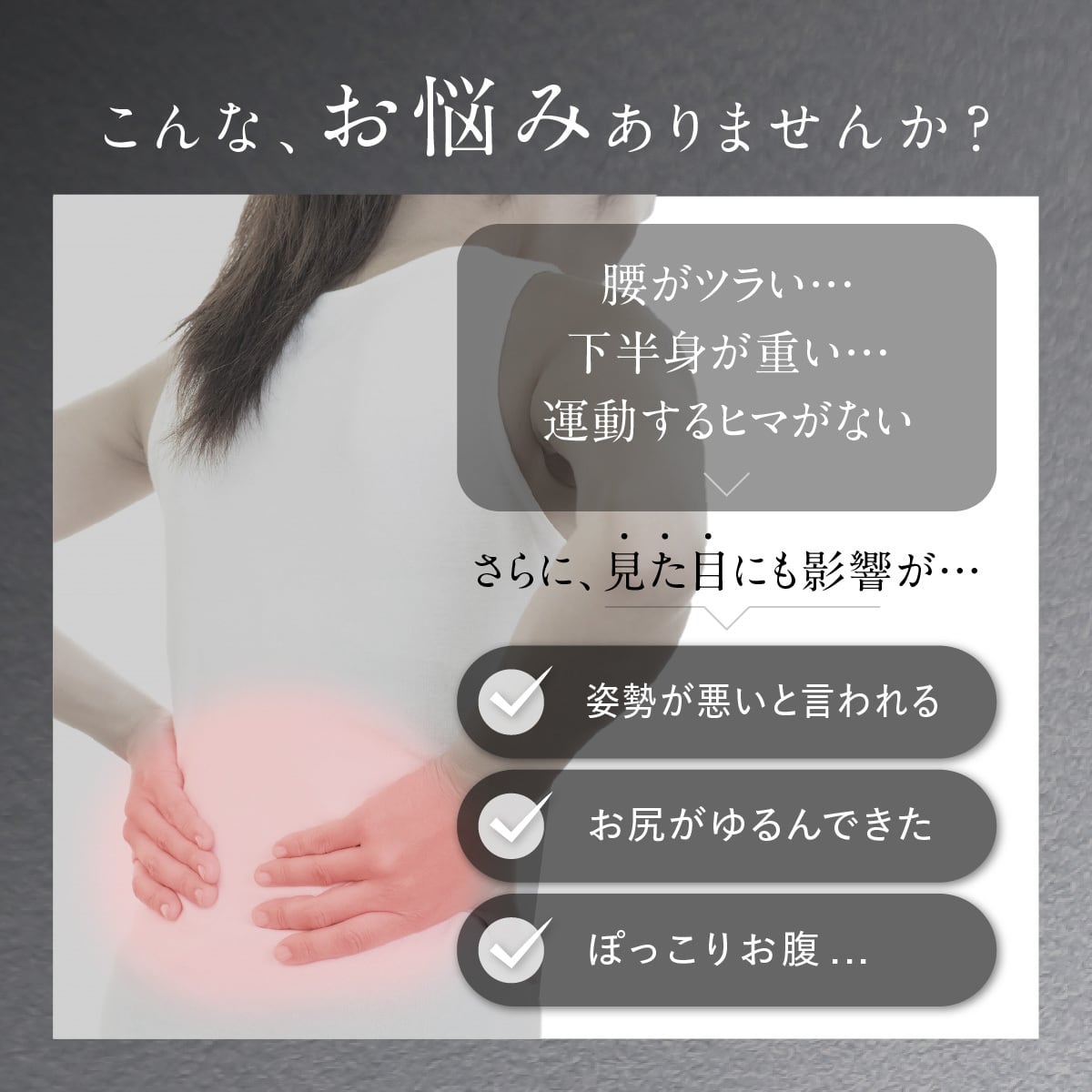 腰が痛い、姿勢が悪い、という悩みをはじめ、腰まわりが緩んできた、ぽっこりお腹が気になる…など引きも切らない腰まわり事情を一気に解決してくれる話題のアイテム。