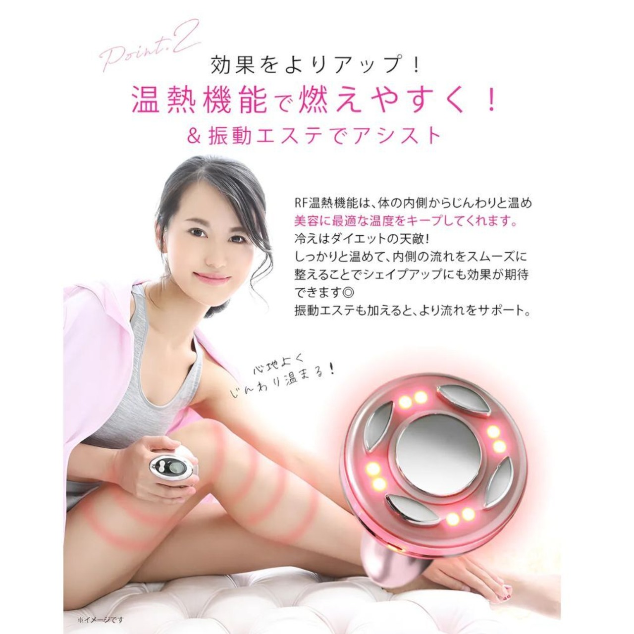 身体に最適な温度までじんわりと温めてくれる機能なんです。 身体を温めることで、キャビテーションの効果を高め る働きが期待できます。